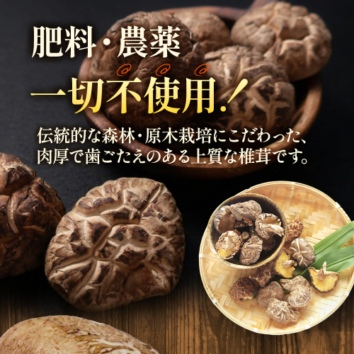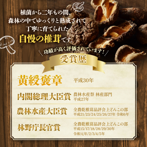 全国の生産者がその品質を競う全国乾椎茸品評会において最優秀の農林水産大臣賞を5連覇を含み過去6度受賞、また平成27年には内閣総理大臣賞を受賞、さらに平成30年にはこれまでの卓越した功績が認められ、黄綬褒章を受章した親子で営む農園。その技はしっかりと継承されています。木漏れ日の降り注ぐ深い森の中で長い時間をかけて育った完全無農薬の原木乾しいたけを、様々な用途にお使いいただけるよう詰め合わせにしました。