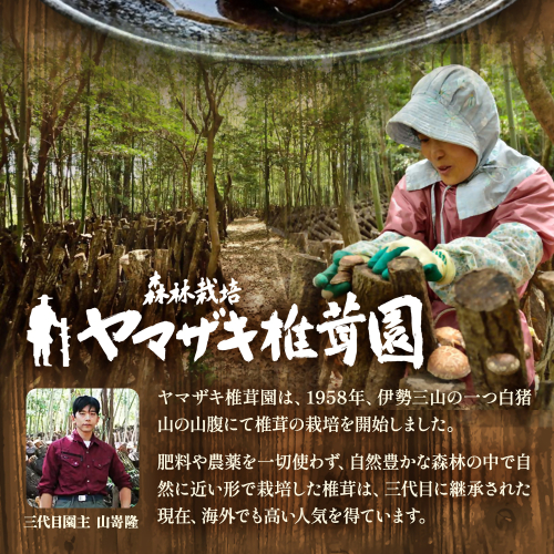 全国の生産者がその品質を競う全国乾椎茸品評会において最優秀の農林水産大臣賞を5連覇を含み過去6度受賞、また平成27年には内閣総理大臣賞を受賞、さらに平成30年にはこれまでの卓越した功績が認められ、黄綬褒章を受章した親子で営む農園。その技はしっかりと継承されています。植菌して山に伏せ込み、2年間の長い熟成期間を経てようやく収穫される肉厚の「どんこ」です。三重の森の中で育った「どんこ」の中でも、特に肉厚で巻きの強いものを厳選しております。 【提供事業者】ヤマザキ椎茸園