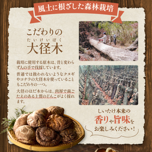 全国の生産者がその品質を競う全国乾椎茸品評会において最優秀の農林水産大臣賞を5連覇を含み過去6度受賞、また平成27年には内閣総理大臣賞を受賞、さらに平成30年にはこれまでの卓越した功績が認められ、黄綬褒章を受章した親子で営む農園。その技はしっかりと継承されています。植菌して山に伏せ込み、2年間の長い熟成期間を経てようやく収穫される肉厚の「どんこ」です。三重の森の中で育った「どんこ」の中でも、特に肉厚で巻きの強いものを厳選しております。