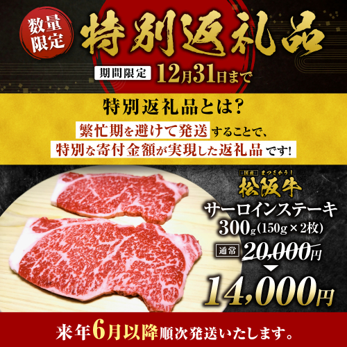 - 【2027年6月以降順次発送】松阪牛 サーロインステーキ 300g(約150g×2枚) 国産 牛肉 ブランド牛 和牛 国産牛 松阪牛 松坂牛 ステーキ サーロイン サーロインステーキ 牛肉 霜降り 松阪牛 ステーキ 松阪牛 サーロイン 松阪牛 サーロインステーキ サーロイン 三重県 多気町 SS-10-062