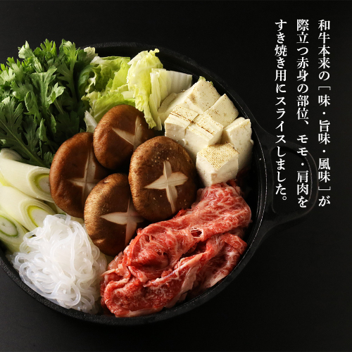 和牛本来の味・旨味・風味が際立つ赤身の部位、モモ・肩肉をすき焼き用にスライスしました。