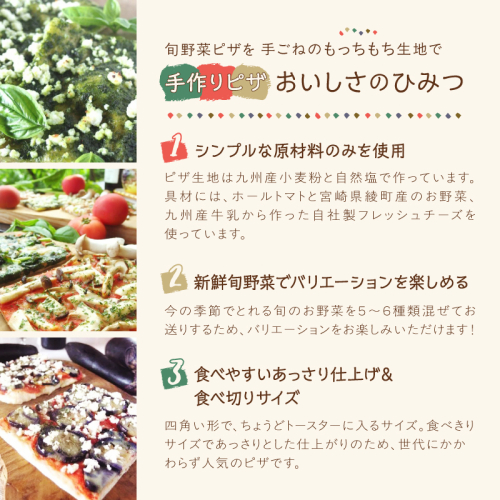 ピザ生地は、九州産小麦粉と天然酵母・ベトナム産自然食塩で作り、イタリア産トマトホールのソースと綾町産のお野菜、自家製チーズをトッピング。あっさりした味と四角い食べきりサイズで、若い方から年配の方まで皆様におすすめです。トースターやオーブントースターで温めるだけで、焼き立ての美味しさをお楽しみ頂けます。その時に採れる季節のお野菜のピザをお届けします。