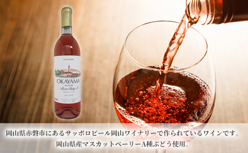 岡山県赤磐市にあるサッポロビール岡山ワイナリーで作られているワインです。 岡山県産マスカットベーリーA種ぶどう使用。 フルティな香り、酸のバランスの良いすっきりした飲み口が特徴です。 ※マスカット・ベーリーA種とは、日本で開発された日本固有のワイン用ブドウ品種です。 ワイン お酒 ※当該返礼品は、原材料の仕入れ、選別、発酵、熟成、濾過、瓶詰までの全ての工程を区域内で行うことにより、全体の付加価値の半分を一定以上上回る割合を占めています。