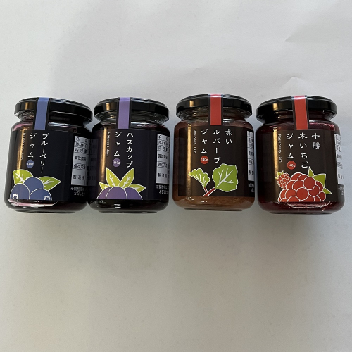ハスカップ、木いちご、ルバーブ、ブルーベリーのジャムを各1個と4種類のうち