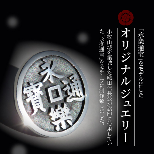 小牧山城を築城した織田信長公が旗印に使用していた「永楽通宝」をモチーフに制作致しましたオリジナルジュエリーです。