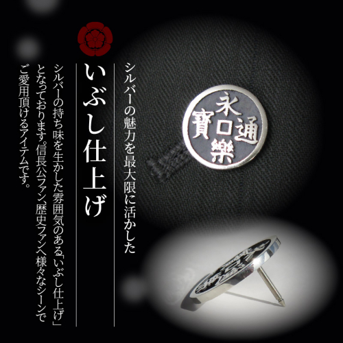 小牧山城を築城した織田信長公が旗印に使用していた「永楽通宝」をモチーフに制作致しましたオリジナルジュエリーです。 シルバーの特性を生かした雰囲気のある「いぶし仕上げ」となっております。 信長公ファン、歴史ファンへ様々なシーンでご愛用頂けるアイテムです。 ※返礼品の重量や付加価値の半分を一定程度上回る割合が小牧市内で行われる工程によるものである。なお、小牧市内で行われる工程は、設計、原型制作、いぶし加工、研磨、本体と留め具の組立である。