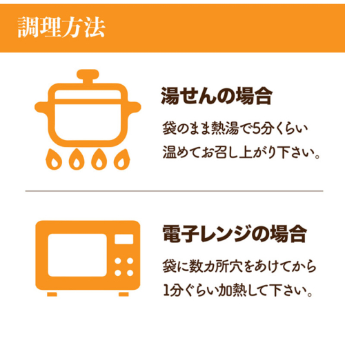※お召し上がり頂く時は、冷凍の状態で袋ごと湯煎で約5分、電子レンジの場合は自然解凍又は流水解凍後器に移し、500wで約1分加熱してください。