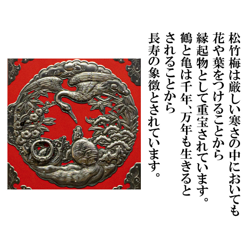 松竹梅は厳しい寒さの中においても花や葉をつけることから縁起物として重宝されています。鶴と亀は千年、万年も生きるとされることから長寿の象徴とされています。伝統の漆塗りの調和が美しく贈答品にお勧めの逸品です。彫金手打金具は、厚さ1.0~2.5ミリの鉄板・銅板・真鍮板等を独自のタガネ数十本を使い分け、一つ一つ打ち出していきます。さび止めや、いぶし、塗装の工程を経て豪華な金具飾りに仕上げられます。