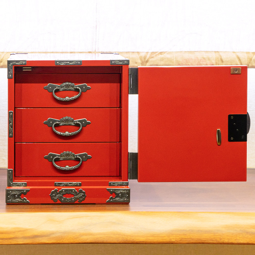 • 【彫金手打金具】仙台箪笥 舟箪笥 ≪鶴亀松竹梅≫ 朱色漆塗り (申込書返送後、3ヶ月~10ヶ月程度でお届け)