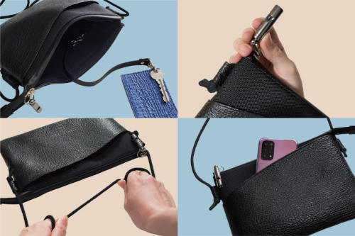 「どんな時も常に身に着ける」をコンセプトに開発したサコッシュサイズのお財布にもなる多機能バッグで、引き手部分は緊急ホイッスルになっています。