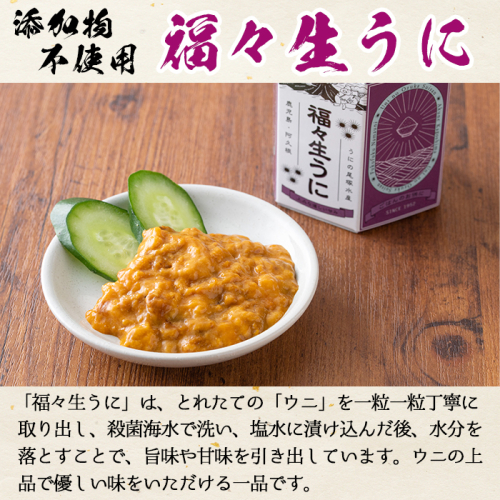 ※一汐生うに 「一汐生うに」は、とれたての「ウニ」を一粒一粒丁寧に取り出し、滅菌海水で洗い、天然塩を一ふりした後、水分を落としてびんつめにした商品です。 ※福々生うに 「福々生うに」は、とれたての「ウニ」を一粒一粒丁寧に取り出し、殺菌海水で洗い、塩水に漬け込んだ後、水分を落とすことで、旨味を甘味を引き出してます。いつでも阿久根にウニの上品で優しい味をいただける一品です。 添加物を使用せずに塩のみで製造しております。保存の際は、冷凍で保存ください。食べる量をお皿に取り出してからお召し上がりください。 販売者:有限会社尾塚水産
