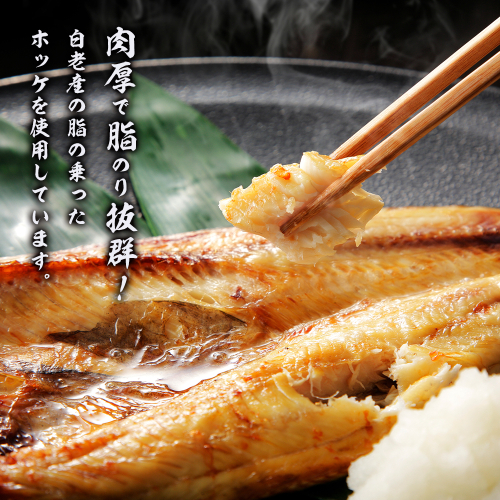 【肉厚で脂のり抜群】白老産の脂の乗ったホッケを使用しています。 こんがりと焼いて身にお箸を入れた瞬間に、中から肉汁が溢れ出します。 普段の晩ご飯やお酒のツマミにはもちろん、 バーベキューにも最適です! じっくり焼いてお召し上がりください。