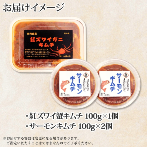 3206. 紅ズワイ蟹 キムチ 100g サーモン キムチ 100g×2個 カニ かに 蟹 鮭 生食可 海鮮 ピリ辛 紅 ズワイガニ 紅ずわい蟹 おかず ご飯のお供 おつまみ 酒の肴 送料無料 北海道 弟子屈町