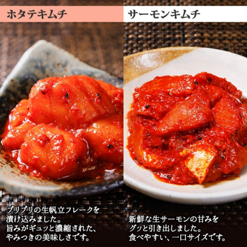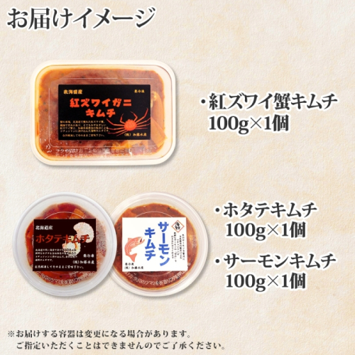 - 【年内配送 12月20日まで受付】2523. 紅ズワイ蟹キムチ サーモンキムチ ホタテキムチ 各100g セット カニ かに 蟹 鮭 生食可 海鮮 紅 ズワイガニ 紅ずわい蟹 帆立 おかず ご飯のお供 おつまみ 酒の肴 送料無料 北海道 弟子屈町