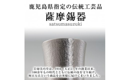 《100年以上の老舗店・薩摩錫器工芸館》 日本酒や焼酎を鹿児島県の伝統工芸品に認定されている「薩摩錫器」と一緒にいかがでしょうか。 「美しい器にこだわるとさらにおいしく───」 錫器の程よい重みと質感が手になじむグラス。薩摩切子をイメージして施しました。 光の当たり方によってキラキラと見え方が変化する様子をお楽しみください。 ギフトとしての贈り物にも喜ばれる一品。大切なあの人に錫器を贈りませんか。 【薩摩錫器とは】 鹿児島県霧島市を代表する伝統工芸品です。 300年の歴史を持つ薩摩藩ゆかりの錫細工です。 錫器は使うほどに味わいが出て手にするとずっしりと重みと温かさがあります。 また、イオン効果があり、焼酎の味がまろやかになるといわれています。 薩摩錫器工芸館 株式会社 0995-45-0177 https://www.satsumasuzuki.co.jp/ 《地産理由》市内で製造・加工された工芸品