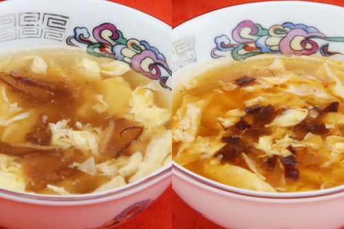 気仙沼産ふかひれを使用し、鶏・豚ガラスープで仕上げた、醤油中華風味のスタンダードなふかひれスープと豆板醤の風味をきかせピリリとしながらも、すっきりとした辛味に仕上げたふかひれスープの食べ比べセットです。