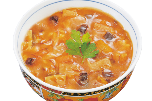 ガラスープ(豚肉・鶏肉を含む)(国内製造)、たけのこ、にんじん、植物油(ごまを含む)、ふかひれ、きくらげ、でん粉、香味油、砂糖、紹興酒、オニオンエキス、醤油(小麦・大豆を含む)、しょうが、食塩、オイスターソース、貝エキス、にんにく、香辛料 / 増粘剤(加工デンプン、キサンタンガム)、調味料(アミノ酸等)、香辛料抽出物(乳由来)、酸味料、カラメル色素