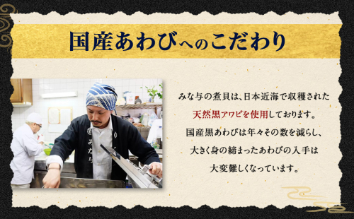 みな与の煮貝は、日本近海で収穫された天然黒アワビを使用しております。