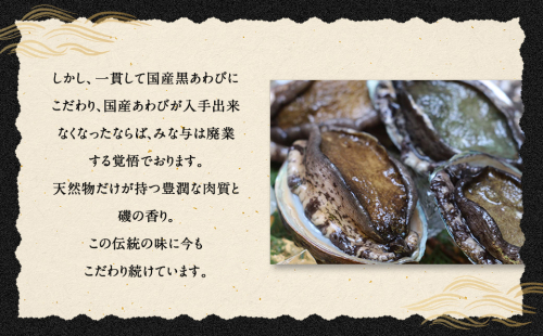 国産黒あわびは年々その数を減らし、大きく身の締まったあわびの入手は大変難しくなっています。