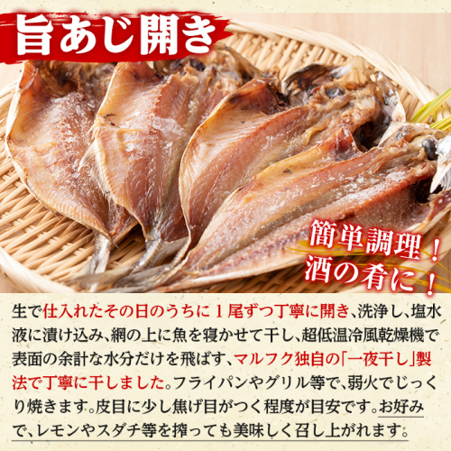 鹿児島県阿久根市の北さつま漁港に、その日に揚がった生の魚をその日のうちに乾燥する鮮度重視の加工法で、魚が持つ旨みと栄養を凝縮した干物です。旨あじ開き一夜干しは無添加、薄塩による味付けを施しております。 生で仕入れたその日のうちに1尾ずつ丁寧に開き、洗浄し、塩水液に漬け込み、網の上に魚を寝かせて干し、超低温冷風乾燥機で表面の余計な水分だけを飛ばす、マルフク独自の「一夜干し」製法で丁寧に干しました。 フライパンやグリル等で、弱火でじっくり焼きます。皮目に少し焦げ目がつく程度が目安です。お好みで、レモンやスダチ等を搾っても美味しく召し上がれます。 販売者:有限会社マルフク川畑水産