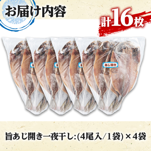 旨あじ開き一夜干し(計16枚・4尾入×4袋)国産 魚介 干物 ひもの 乾物 鯵 セット おかず おつまみ【マルフク川畑水産】akn029-09