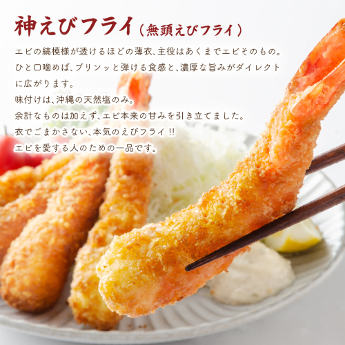 えび姫(有頭えびフライ)  海老みそやパリパリの歯ごたえがたまらない足の部分も楽しめるえびフライです。下味には沖縄の天然塩を使用しています。(未加熱調理品) 神えびフライ(無頭えびフライ) 頭が付いてないので食べやすい大きなえびフライです。お子様でもあんしんです。下味には沖縄の天然塩を使用しています。(未加熱調理品) 産地:インドネシア/ベトナム フィッシュ棒(白身フライ) 外はサクサク、中はふわふわで全く臭みの無い白身フライです。お弁当のおかずなどに最適ですよ。(未加熱調理品) 【地場産品に該当する理由】 当該返礼品は、返礼品の付加価値の半分を一定以上上回る割合が区域内で行われる行程によるものです。(告示第5条第3号に該当)
