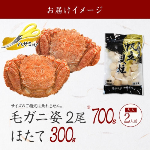 - 3419. 毛蟹 2尾 計700g前後 ホタテ 300g 専用ハサミ・食べ方ガイド付き 毛ガニ 毛がに 蟹 カニ カニ味噌 ほたて 帆立 貝柱 海鮮 ボイル 北海道 弟子屈町