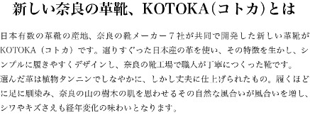 【配送不可:離島】 『奈良の靴メーカー7社が共同開発した革靴KOTOKA』  奈良県大和郡山市は日本有数の革靴の産地。この地で昔からひたむきに革靴作りに向き合ってきた靴メーカー7社が共同開発した革靴「KOTOKA」はシンプルで履きやすいデザインが特徴。甲革には鎌倉時代に遡る歴史を持つ日本最大の革の産地、兵庫県たつの市の中で、特に丁寧な加工で評価の高いタンナー「マルヒラ」で、植物タンニンで二次なめしされた革を使用。製造過程で通常2回使用するドラムを、『なめし、染め、蝋引き、揉み』の計4回使用し、手間をかけてつくられた革です。色ムラやシワが、履くほどに深い味わいを醸し出します。古都ラインの靴はこの革の風合いを生かした、シンプルで履きやすく、飽きのこないデザインの靴です。