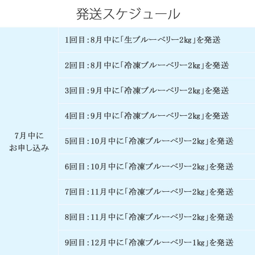 6月中旬~8月初旬までは生のブルーベリーを、8月中旬以降は冷凍ブルーベリーをお送りします。