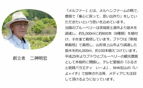 自然豊かな四国山地、赤石連峰から流れ出る清流に育てられた『完熟ブルーベリー』です。約800本のブルーベリーの樹から、大粒で、程よい酸味のある物だけを選別してお届けしますので、きっとご満足いただけることと思います。