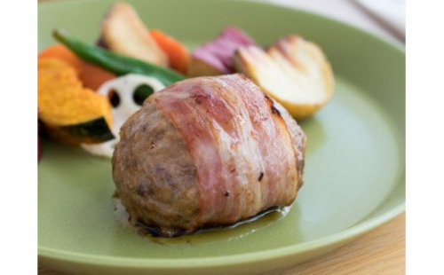 ハンバーグは繋ぎに近江八幡市特産品の丁字麩を使用しました。近江牛100%ハンバーグにベーコンを巻いて仕上げました。