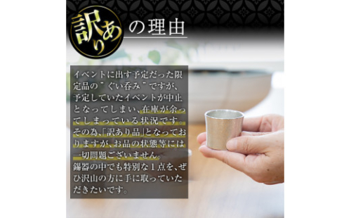 《100年以上の老舗店・薩摩錫器工芸館》 錫のぐい呑みは、日本酒を飲むのにピッタリです。 手におさまるちょうどよいサイズのぐい呑み。 職人の手によって生み出されるしなやかな飲み口を実感してください。 シンプルなデザインで若い方からご年配の方まで幅広い方におすすめです。 ギフトとしての贈り物にも喜ばれる一品。ペアでのご使用も大変おすすめです。 【訳ありの理由】 イベントに出す予定だった限定品のぐい呑みですが、予定していたイベントが中止となってしまい、在庫が余ってしまっている状況です。 その為、「訳あり品」となっておりますが、お品の状態等には一切問題ございません。 錫器の中でも特別な1点を、ぜひ沢山の方に手に取っていただきたいです。 【薩摩錫器とは】 鹿児島県霧島市を代表する伝統工芸品です。 300年の歴史を持つ薩摩藩ゆかりの錫細工です。 錫器は使うほどに味わいが出て手にするとずっしりと重みと温かさがあります。 また、イオン効果があり、焼酎の味がまろやかになるといわれています。 薩摩錫器工芸館 株式会社 0995-45-0177 《地産理由》市内で製造・加工された工芸品