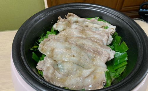 (3)豚バラ肉をネギの上に乗せ、塩こしょうをふり、フタをして7分ほど蒸す。