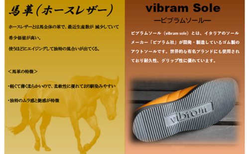『独特な風合いの馬革と高性能なビブラムソールを使用したタウンカジュアルシューズ』