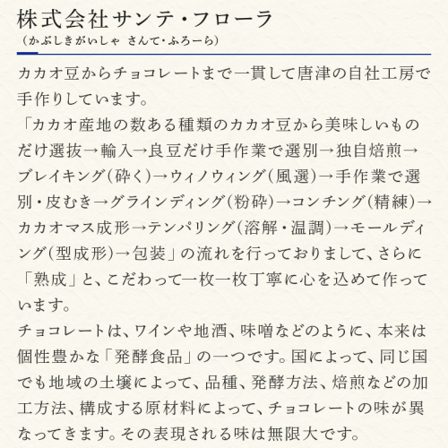 カカオ豆からチョコレートまで一貫して唐津の自社工房で手作りしています。