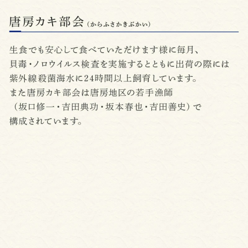 出荷の際には紫外線殺菌海水に24時間以上飼育しています。また唐房カキ部会は唐房地区の若手漁師で構成されています。