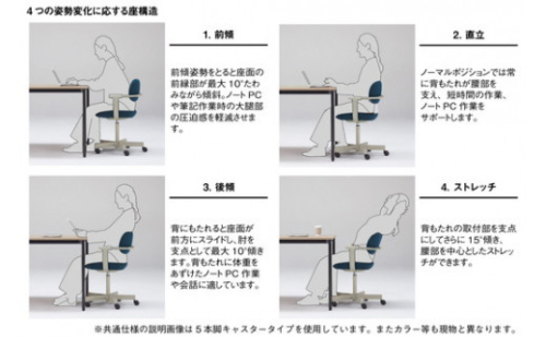 また、体重を前へ移動させると、座面が前方に傾斜。大腿部への圧迫を感じさせることなく、デスクワークを快適にサポートします。一見、そのリビングライクな姿からは、想像もつかない多彩な機能を搭載した“vertebra03”。ワークチェアの未来はこのイスから始まります。