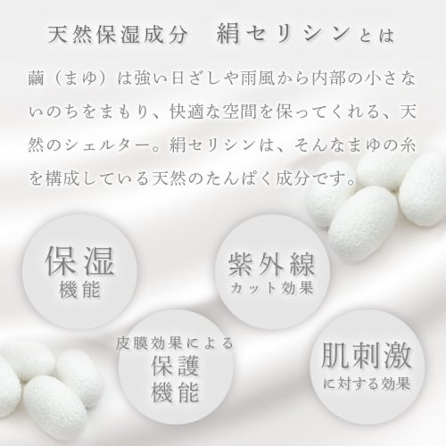 京都・丹後地方は絹織物<丹後ちりめん>のふるさと。丹後織物工業組合では天然素材「絹」が持つ力を大切に考え丹後ちりめんから絹セリシンを水だけで抽出することによって安全性を高め、まゆの糸が自然の状態で発揮するすばらしい性質を引き出しました。絹のめぐみを多くの方に感じていただきたい・・・それが私たちの思いです。