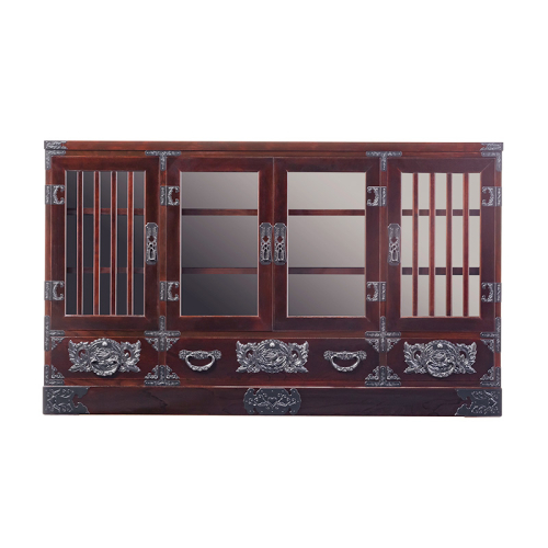 大きなガラス窓付の観音扉を開けると調整可能な棚板が出し入れを自由に、更に美しい収納を手助けしてくれます。