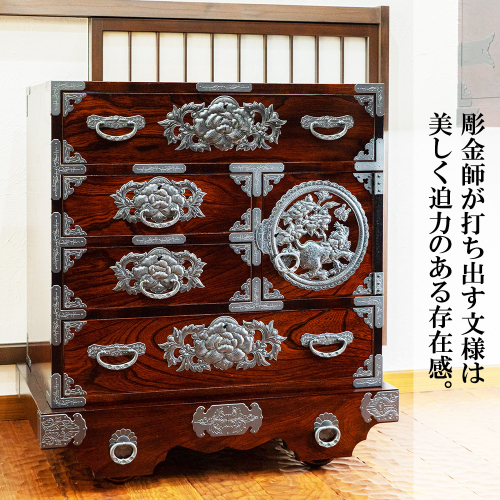 【彫金手打金具】仙台箪笥 中型車箪笥 ≪牡丹・唐獅子≫ 拭き漆塗り (申込書返送後、3ヶ月~8ヶ月程度でお届け) 392697 - 宮城県利府町