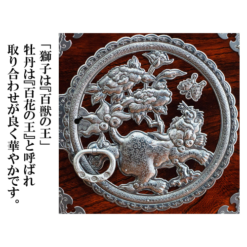 金具:錠前(4杯の引き出し牡丹金具、扉の唐獅子牡丹金具):彫金手打金具