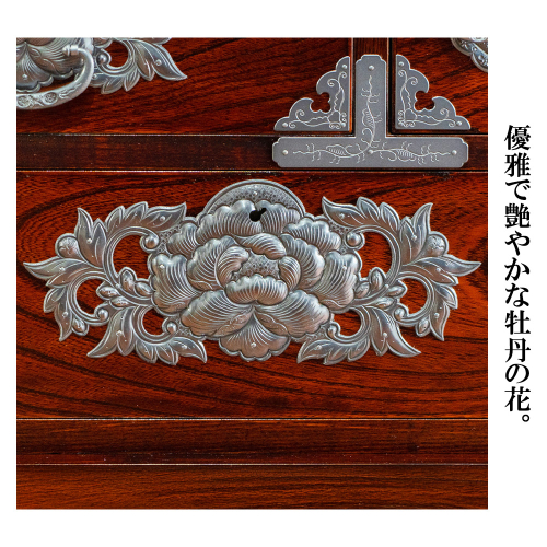 4杯の引き出しの牡丹金具、片開扉の唐獅子牡丹金具は彫金手打金具、その他は欅産業オリジナルの鍛造金具で仕上げています。
