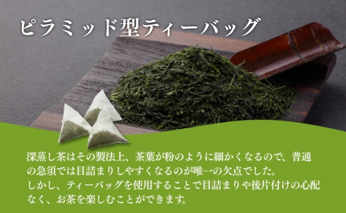 当店の特上深蒸し茶ティーバッグは、発売以来、多くのお客様にご愛用頂いている人気商品です。ティーバッグで本格的なお茶の味を楽しみたい方にぜひお勧めのお茶です。特上深蒸し粉茶を使用し、独自の火入技術で香ばしい甘みと香りを引き出して仕上げます。冷やして淹れても、熱く淹れてもおいしい手軽で便利なティーバッグをお試し下さい。 ・一番茶深蒸し茶のそれも味のよい特上粉茶のみ使用。 ・独自の火入技術で香味を引き出す。 ・ティーバッグの材質がピラミッド型のナイロン素材だからよく出る。 夏は冷茶としても美味しく飲めます。ひとり用のひもつきティーバッグですので、急須いらずで手軽に簡単においしく飲むことができます。