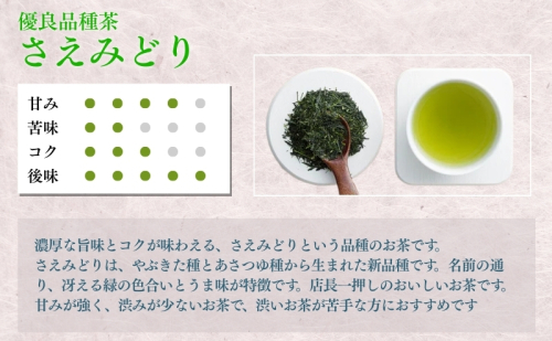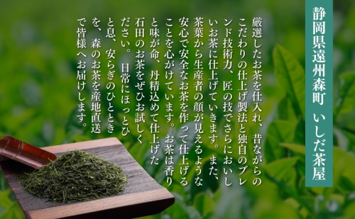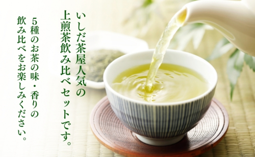 遠州森の茶問屋いしだ茶屋人気の上煎茶飲み比べセットです。ご家庭用に贈り物にもおすすめです。深山は当店一番人気の上煎茶、甘みと渋みとコクのバランスがいいお茶です。森の深蒸し茶ふくよ香はまろやかでコクのある深蒸し茶です。優良品種茶あさつゆは天然玉露ともいわれ、上品な香り、鮮やかな水色と甘味が特徴です。優良品種茶さえみどりはさえる緑の水色、甘みと旨味があり渋みが少ないお茶です。掛川茶は深蒸し製法のお茶で濃く何杯飲んでも飽きのこない味です。あなたのお気に入りのお茶がきっと見つかります。