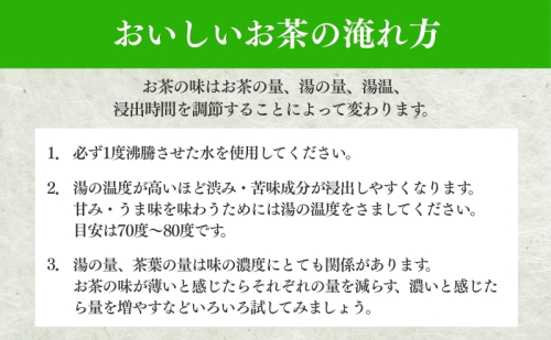 濃厚な旨味とコクが味わえる、さえみどりという品種のお茶です。さえみどりは、やぶきた種とあさつゆ種から生まれた新品種です。名前の通り、冴える緑の色合いとうま味が特徴です。甘みが強く、渋みが少ないお茶で、渋いお茶が苦手な方におすすめです。