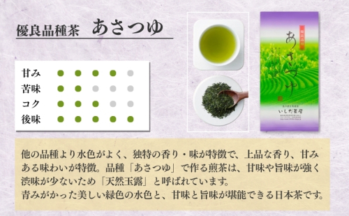 別名天然玉露といわれる品種あさつゆです。あさつゆは、他の品種より水色がよく、独特の香り・味が特徴です。上品な香り、甘みのある味わいで人気のお茶です。あさつゆの特徴はなんといってもその鮮やかな水色にあります。見ておいしい、飲んでおいしい深蒸し茶です。