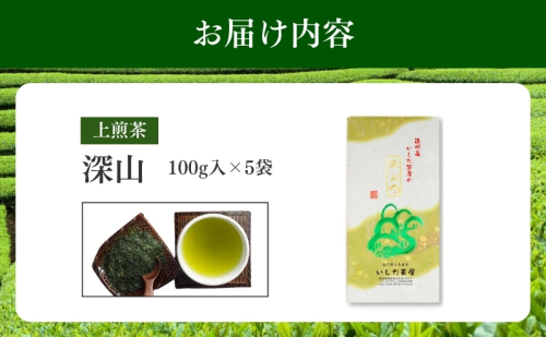 遠州森の茶問屋いしだ茶屋一番人気の上煎茶深山100g入×5袋です。甘みと渋みとコクのバランスがいい中蒸し煎茶です。贈答用に、ご家庭用にオススメのお茶です。 四月下旬から五月上旬にかけて、若葉の中から甘み旨味の多く含まれているものを選びました。特に味にこだわって仕上げました。甘みと旨味がありほどよい渋味もある、当店で最も人気のある商品です。