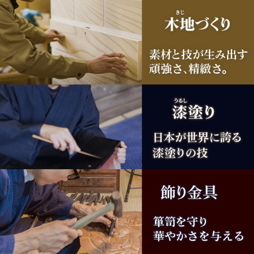■地場産品に該当する理由:宮城県の伝統工芸品である仙台箪笥を町内にて企画・デザイン、組み立て、金具装着、磨き、最終仕上げまでの全ての工程を行っている。