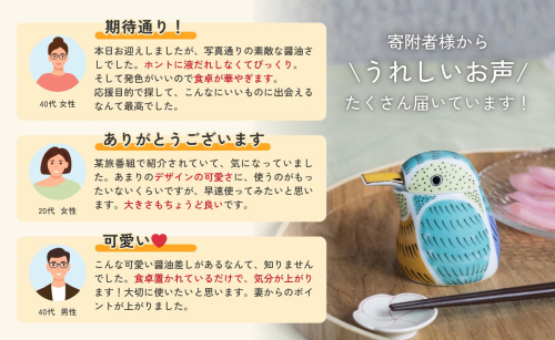 有田焼で作られたカワセミの形をした可愛らしい醤油さしです。 液ダレしない構造なので食卓を汚すこともありません。 カワセミのつがいは仲睦まじいことから夫婦円満の象徴としても知られています。 また、狙った獲物は逃さない様子から「目標を達成し、望みをかなえる」縁起のいい吉鳥とされています。 結婚祝いや受験を控えた方へのプレゼントにもピッタリの商品です。 窯元:幸楽窯 商社:山忠