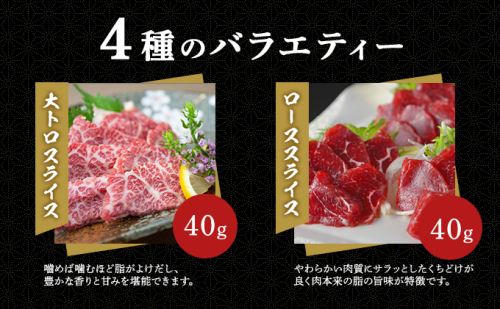 • 馬刺し 熊本 ユッケ 霜降り 鮮馬刺し スライス 4種 バラエティーセット 食べ比べ 馬刺 馬肉 肉 お肉 冷凍
